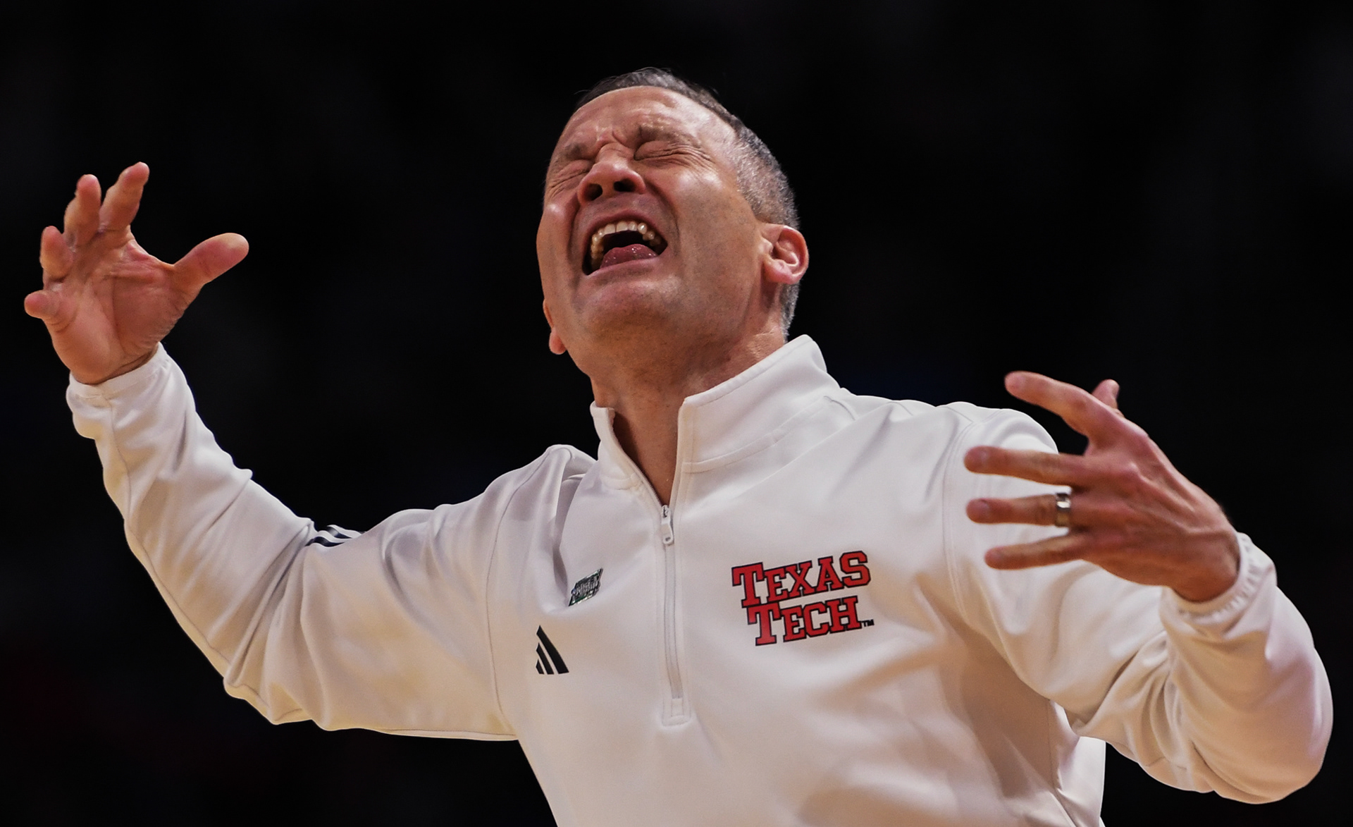 Texas Tech head coach Grant McCasland screams at his team during the second half of an NCAA Tournament second round game between Drake and Texas Tech on Saturday, March 22, 2025, at Intrust Bank Arena in Wichita, Kan. Tech won the game and advanced to the Elite Eight, where they lost to eventual national champion Florida.