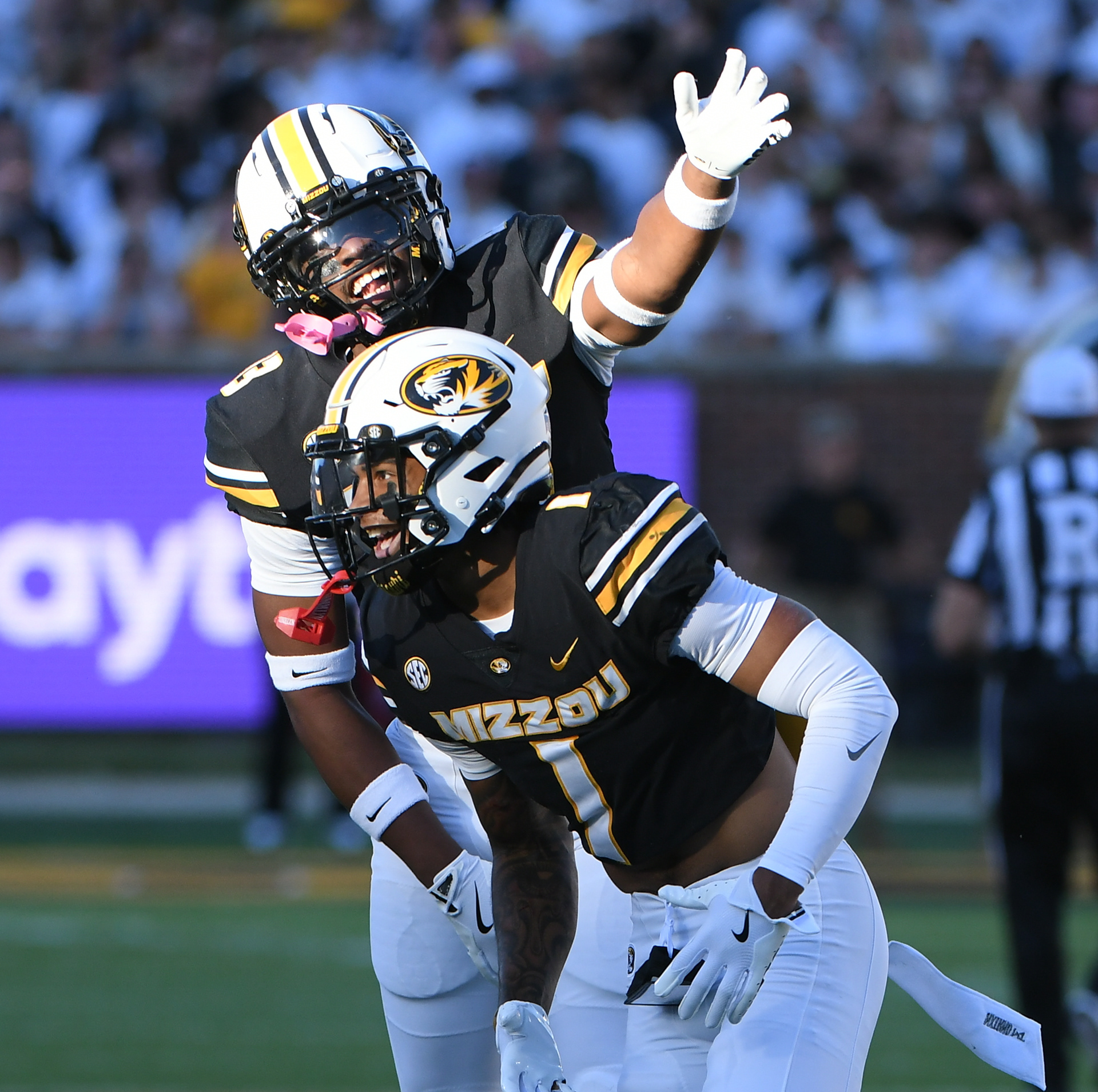 Missouri safety Daylan Carnell (13,) top, and Missouri safety Marvin Burks Jr. (1) celebrate Burks intecepting Buffalo quarterback C.J. Ogbonna in the first half of a game against Buffalo on Saturday, September 7, 2024, at Faurot Field in Columbia. (Cal Tobias/Rock M Nation)