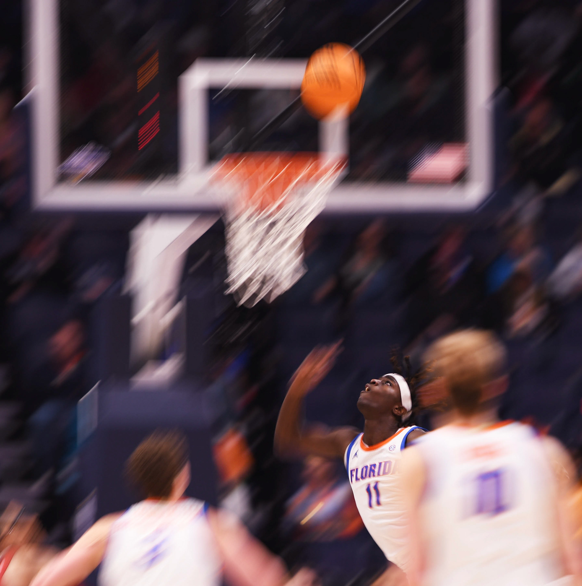 Florida guard Denzel Aberdeen (11) watches to see his shot during the second half of an SEC Tournament semifinal game against Alabama on Saturday, March 15, 2024, at Bridgestone Arena in Nashville, Tenn. Aberdeen went for 11 points as Florida beat Alabama 104-82. Florida then advanced to the SEC championship game, where they defeated Tennessee for the conference title, and eventually won the 2024-25 national championship.