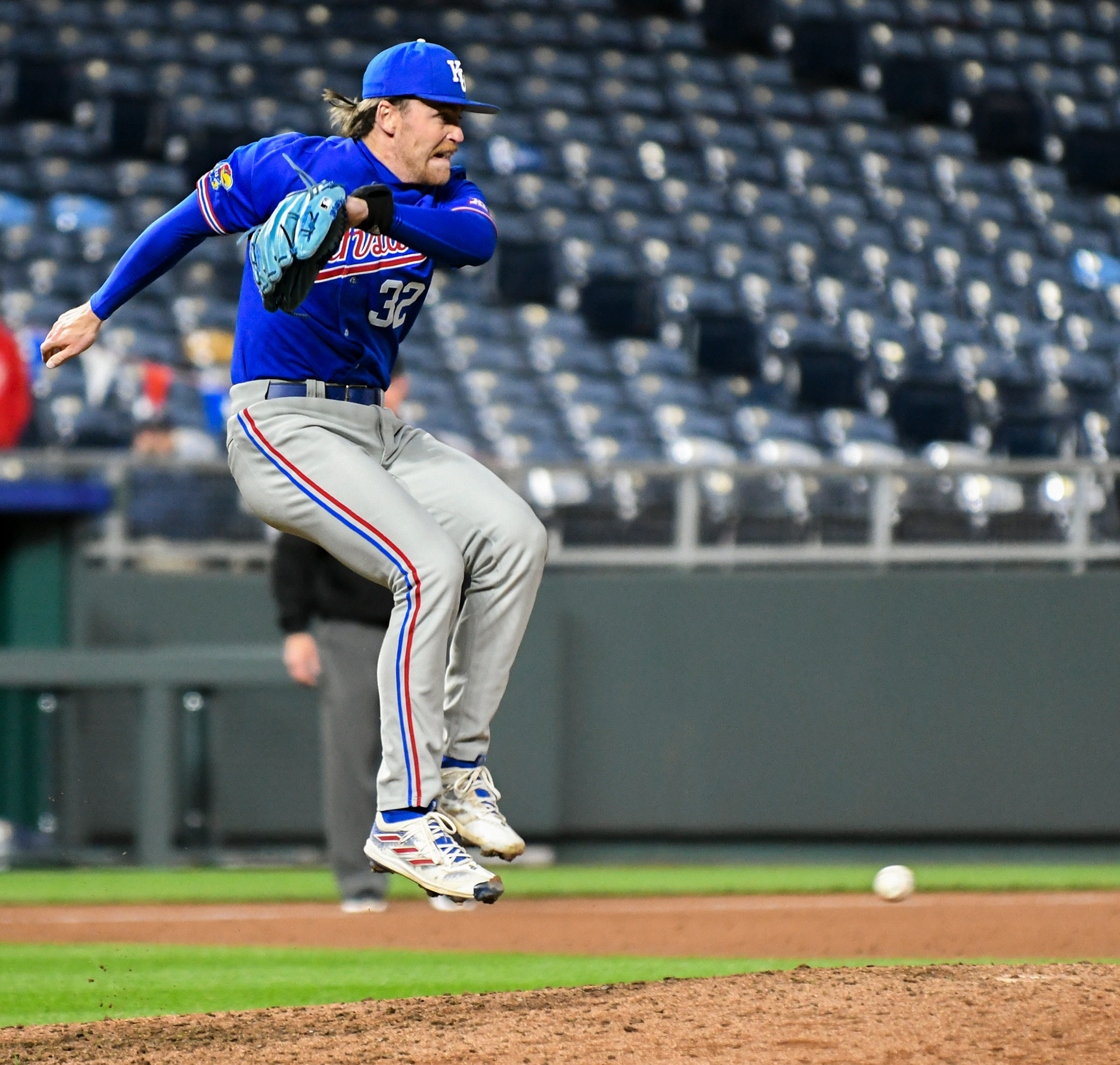 Kansas pitcher Hunter Cranton (32) leaps to dodge a comebacker line drive from Missouri's Jackson Beaman during a game on Tuesday, Mar. 19, 2024 at Kauffman Stadium in Kansas City, Mo.