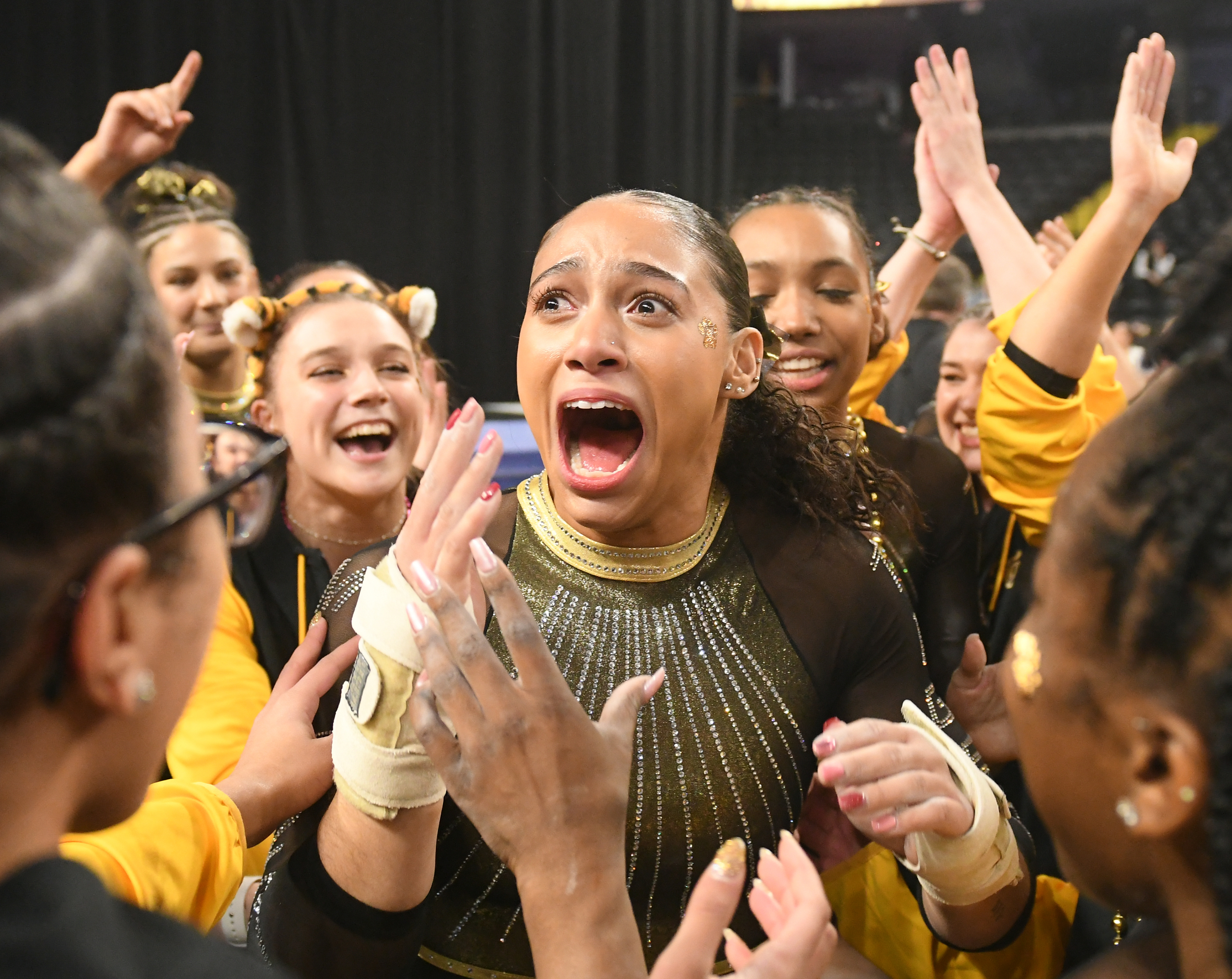 Missouri gymnast Kennedy Griffin celebrates her perfect 10.0 floor exercise at the “Zou to the Lou” quad meet on Friday, Feb. 14, 2025, at Family Arena in St. Charles, Mo. Griffin’s 10 was one of seven in Mizzou gymnastics history, and propelled MU to win the quad meet.