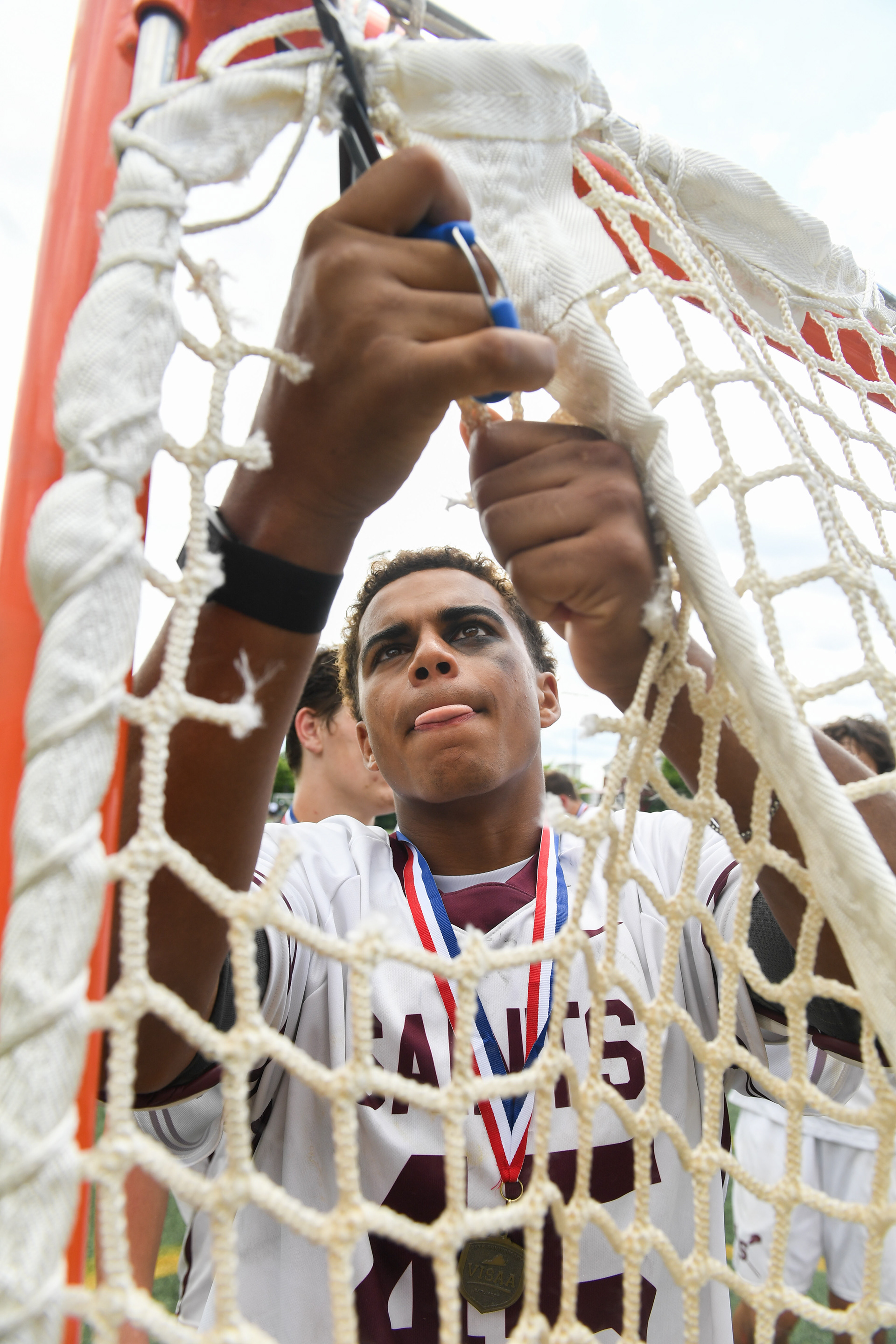 St. Anne’s-Belfield’s Harrison Morris (45) cuts down a piece of the net after defeating Paul VI in the VISAA state championship on Sunday, May 18, 2025, at Frank G. Addonizio Field in Charlottesville.