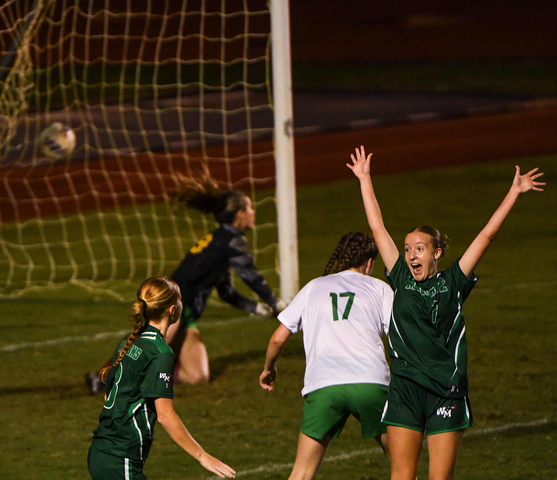 William Monroe midfielder Sadie Williams (7) celebrates after scoring a goal to put Monroe up 3-2 against Maggie Walker in the VHSL Region 3B quarterfinals on Friday, May 30, 2025, at William Monroe High School in Stanardsville.