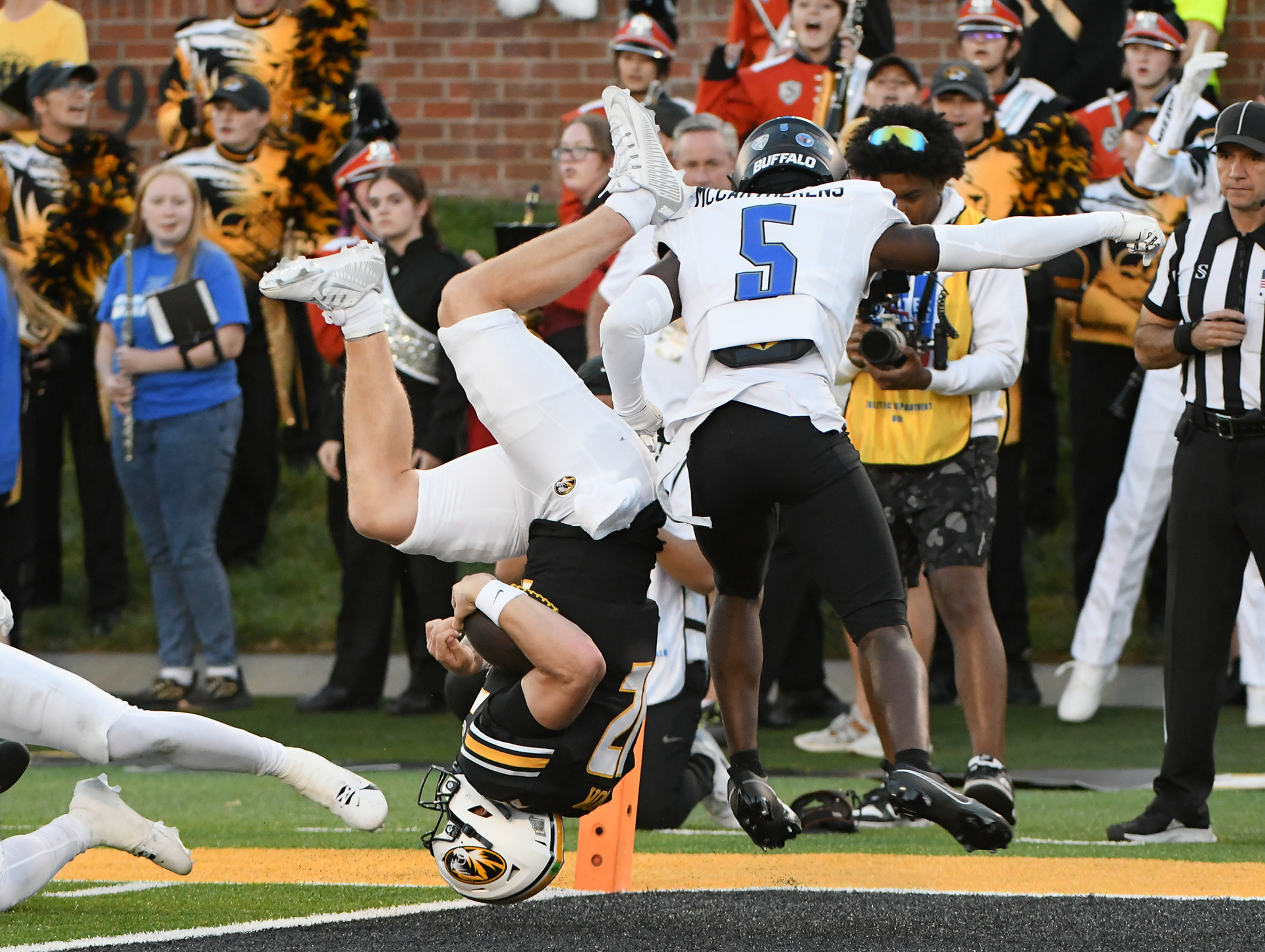 Missouri quarterback Brady Cook (12) flips into the end zone for a touchdown in the first half of a game against Buffalo on Saturday, September 7, 2024, at Faurot Field in Columbia, Mo.