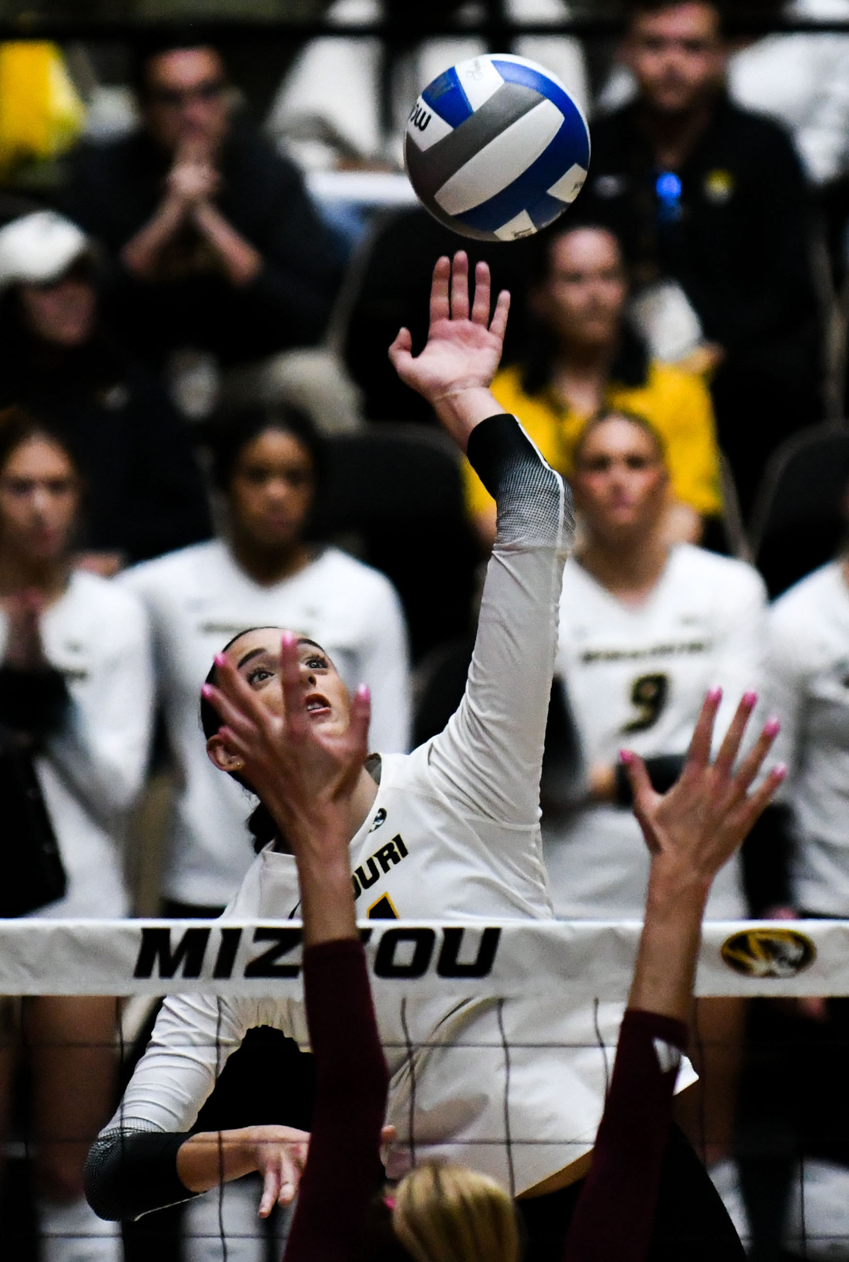 Missouri's Jordan Iliff (4) hits the ball during a game against Mississippi State on Sunday, Oct. 20, 2024, at the Hearnes Center. (CAL TOBIAS/ROCK M NATION)