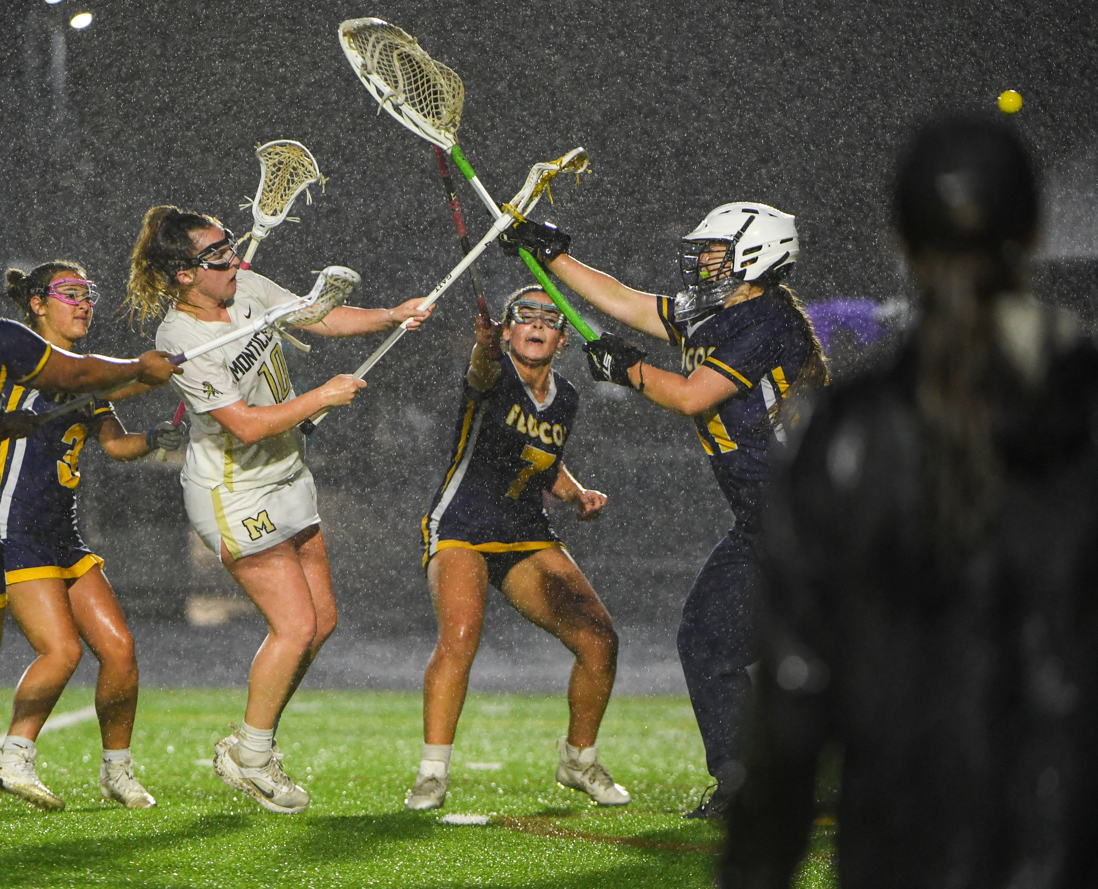 Monticello midfielder Lauren Garrett (10) scores on plays Fluvanna County goalkeeper Megan Drumheller in a game on Tuesday, May 27, 2025, at Monticello High School in Charlottesville.